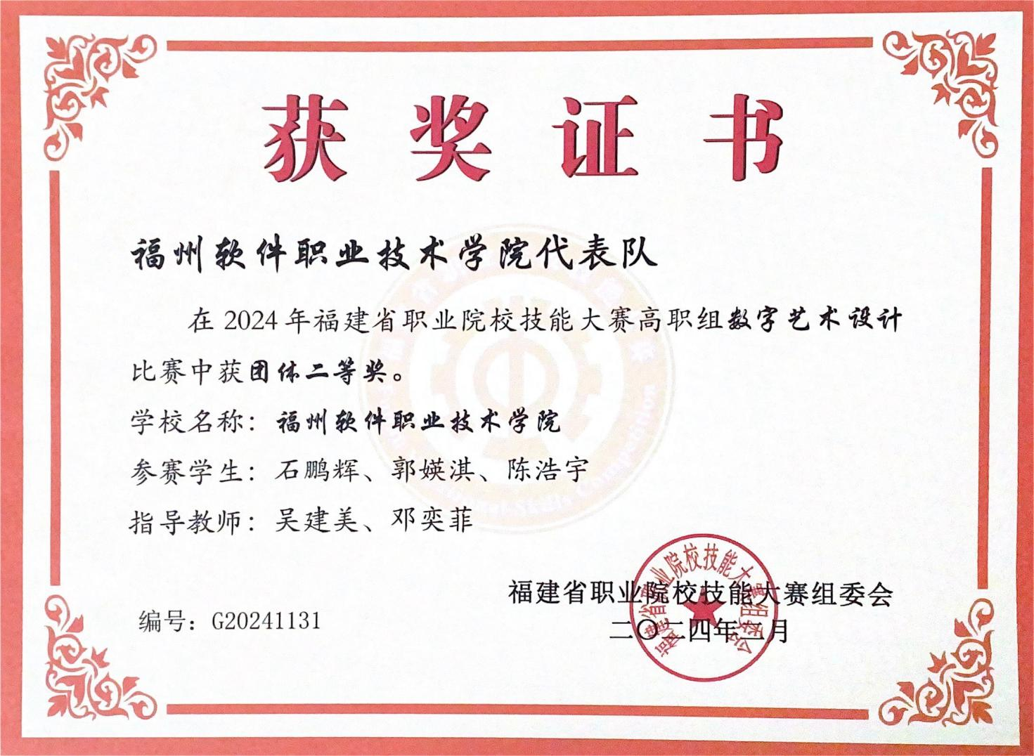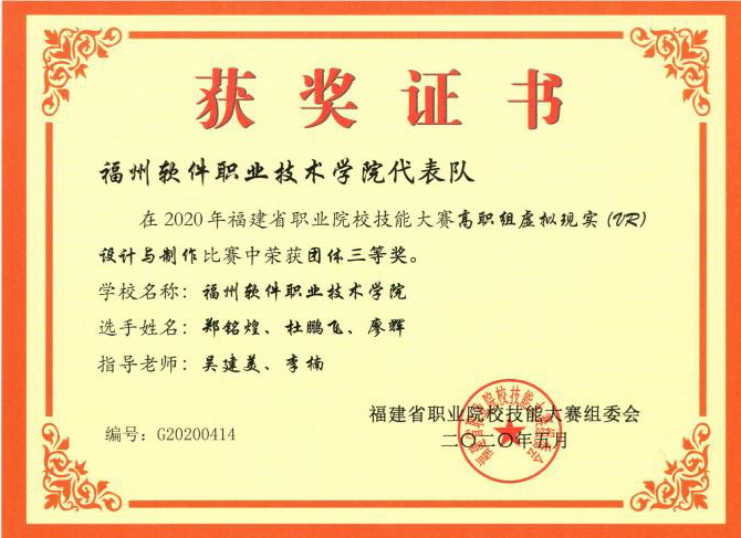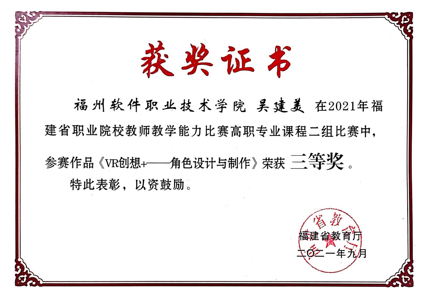 获奖情况:获省级教学成果奖一等奖1项;参加福建省职业院校技能大赛教学能力比赛获一等奖1项、三等奖1项;获第五届全国数字创意教学技能大赛三等奖1项;指导学生参加福建省职业院校技能大赛获得二等奖1项、三等奖1项;2023一带一路暨金砖国家技能发展与技术创新大赛获二等奖1项;第九届海峡两岸暨港澳大学生职业技能大赛获三等奖1项。获学院“第七届教师说课”比赛二等奖、“最美教师”、“优秀教职工”、“学院人才培养工作评估积极分子”等荣誉称号。