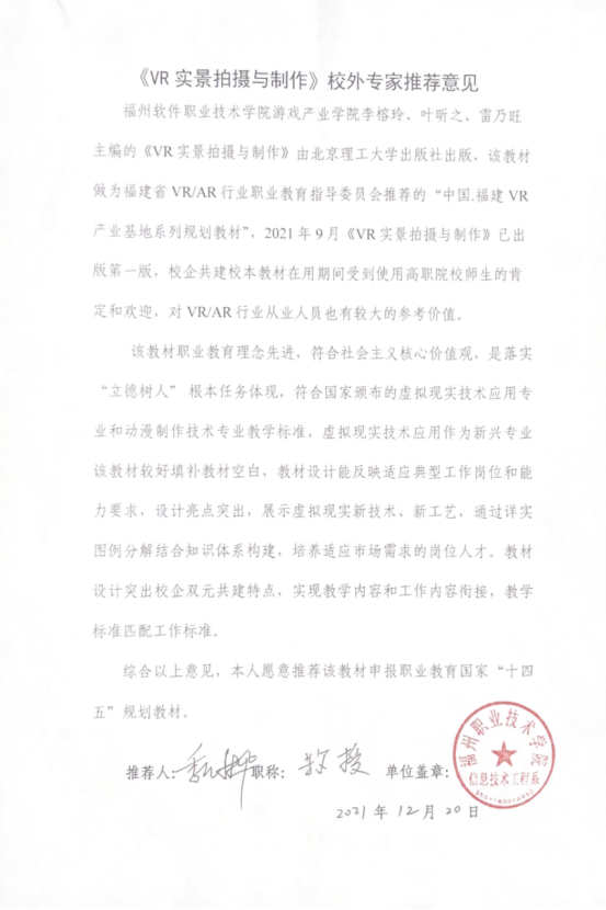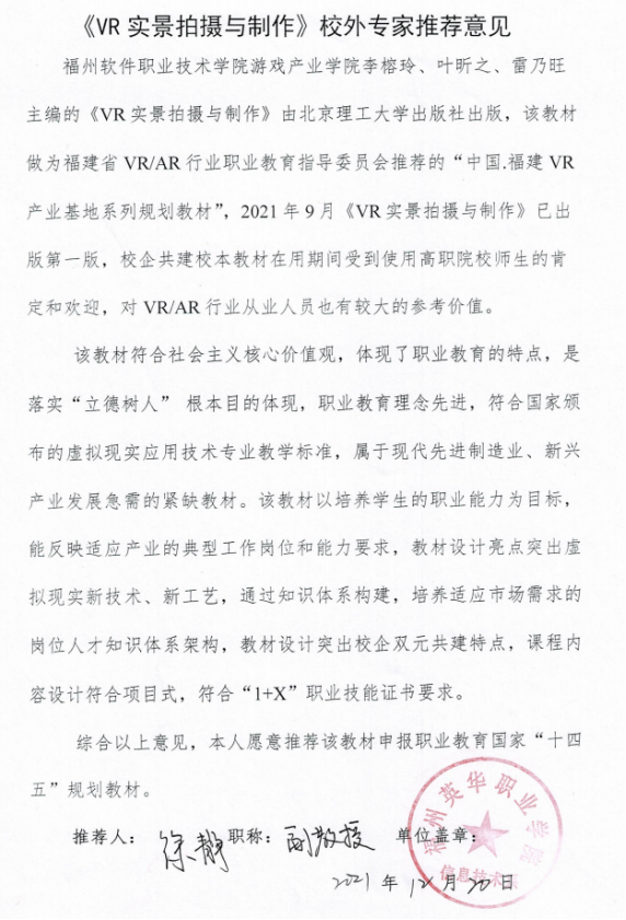 江荔,副教授,福州职业技术学院虚拟现实技术应用专业主任,福建省VR/AR行业指导委员会委员,福建VR产业基地系列规划教材编写委员会委员。近五年来发表论文11篇,其中CSCD核心收录1篇、EI收录3篇、本科学报1篇,主持省教育厅中青年科技项目3项2项软件著作权,主持福建省职业教育精品在线开放课程1项(通过验收)。主持国家级新一代信息技术虚拟仿真实训基地,主持福建省第一批VR/AR职业教育实训基地,多次指导学生参加职业院校技能大赛获得国家级省级奖项若干。2020年担任中华人民共和国第一届职业技能大赛裁判,2021年担任全国职业技能大赛裁判。